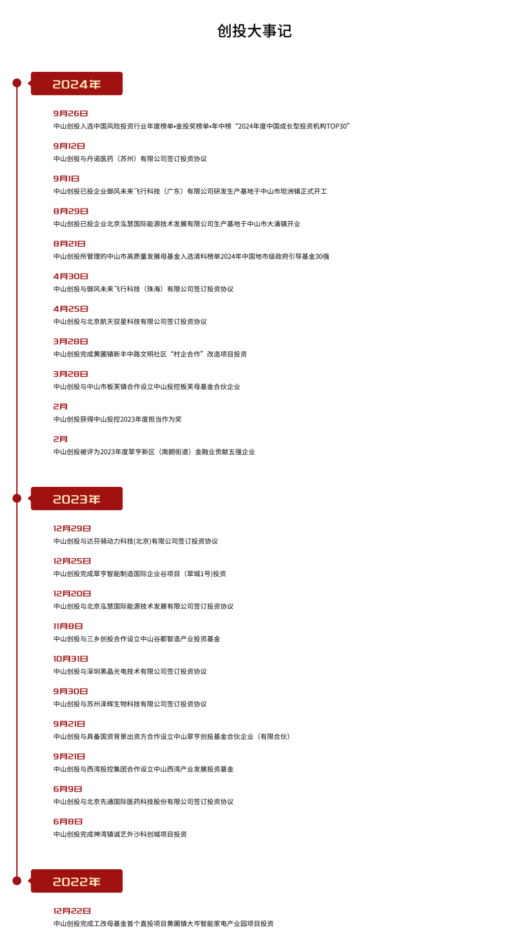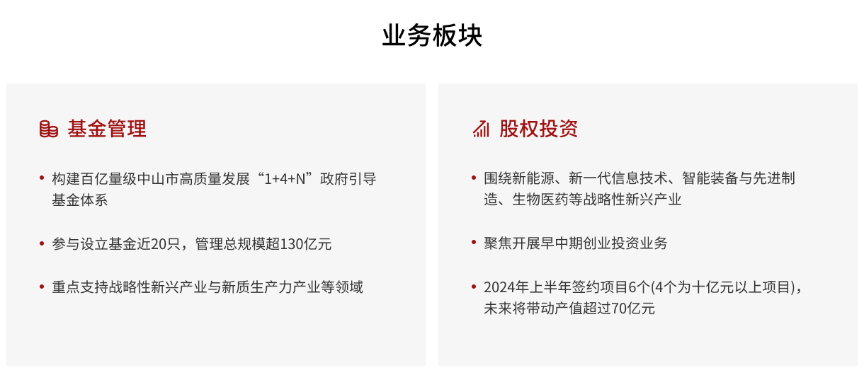 中山創(chuàng)業(yè)投資有限公司(簡(jiǎn)稱“中山創(chuàng)投”)是中山投資控股集團(tuán)有限公司(簡(jiǎn)稱“中山投控”)落實(shí)中山市委、市政府“培育發(fā)展股權(quán)投資旗艦企業(yè)”要求,在中山金控資產(chǎn)管理有限公司及中山投控原有基金管理、股權(quán)投資業(yè)務(wù)基礎(chǔ)上整合組建,是中國(guó)證券投資基金業(yè)協(xié)會(huì)登記備案的私募基金管理人機(jī)構(gòu)(中基協(xié)登記編號(hào): P1065108)。中山創(chuàng)投組建完成后,承載著中山投控投資主業(yè)做強(qiáng)做優(yōu)做大的使命,將圍繞新能源、新一代信息技術(shù)、智能裝備與先進(jìn)制造、生物醫(yī)藥等中山市鼓勵(lì)發(fā)展的戰(zhàn)略性新興產(chǎn)業(yè),推進(jìn)大基金組建、大項(xiàng)目投資、大平臺(tái)建設(shè),開展政府引導(dǎo)基金受托管理、股權(quán)直投等業(yè)務(wù),為中山市經(jīng)濟(jì)高質(zhì)量發(fā)展貢獻(xiàn)國(guó)資創(chuàng)投力量。